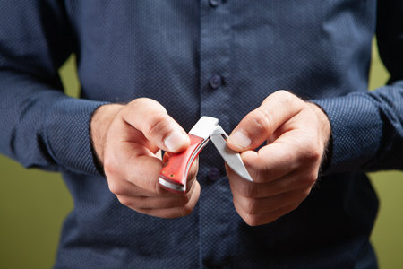 Focused shot of hands stretching and testing polymer blend material that autonomously repairs tears for longlasting durability in active wear