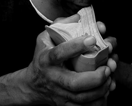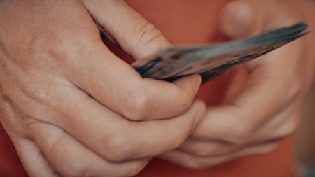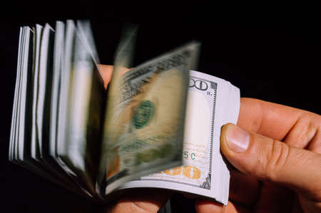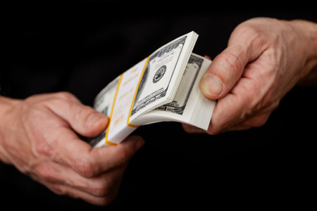 Closeup human hands recounting banknotes in a bundle of dollars isolated on black background. Shallow focus.