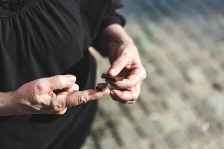 Senior woman holding a piece of a chocolate to her finger - Old caucasian adult craving for dark black sweet food that is about to eat