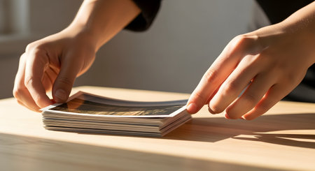 Hands hold and organize a stack of printed photographs on a wooden surface, illuminated by natural light. The scene evokes nostalgia and the tangible value of preserving family memories and travel experiences through physical prints.