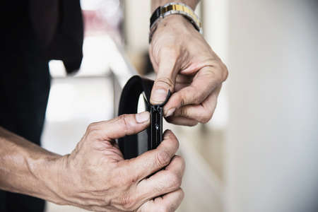 Close-up shot of isolates of male hands holding a lot of stacked 35mm film, obtained by taking pictures with old cameras which were popular in the old days.