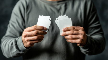A close-up of a person's hands firmly holding a thick stack of handwritten index cards for studying. These flashcards, with highlighted text, represent learning, exam preparation, memorization, and education.