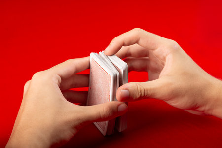 Male hand shuffling playing cards on the table. Board game. Isolated on red background.