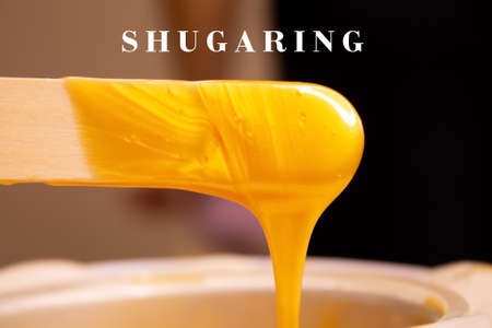 Shugaring paste. Body hair removal. Depilation. The paste drips off the sugaring spatula. Body care products.