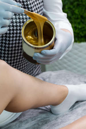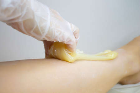 Waxing woman leg. Sugar hair removal. laser service epilation. Salon wax beautician procedure.
