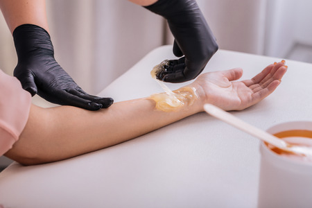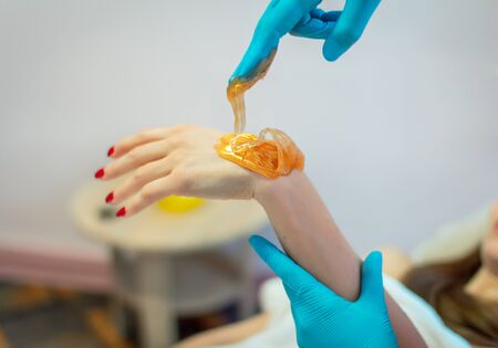 Sugar depilation of hands in the beauty salon. Getting rid of hair on the skin