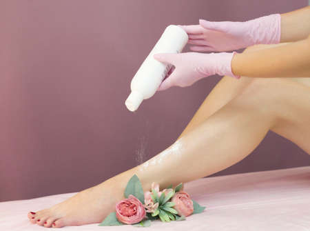 a young woman is sprinkled with powder on her feet without the shugaring procedure. Slim, smooth legs