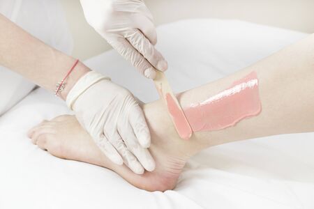 Hair removal from beautiful female legs. Waxing in a beauty salon. Close-up of doctor hands in gloves. Vertical photo