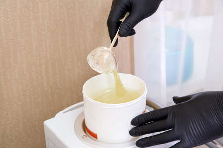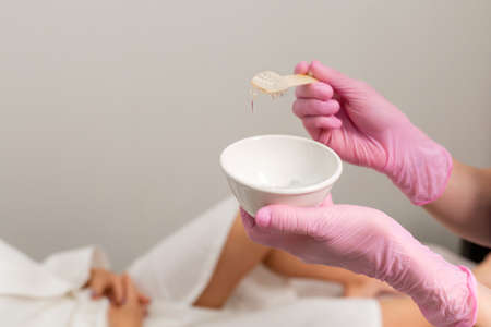The hands of the beautician hold liquid sugar paste or wax for the duration of the depilation procedure in the salon. close up, background image