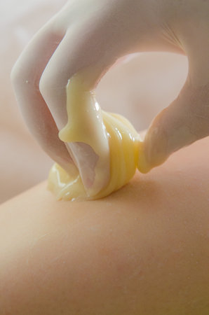 Close up photo of a sugaring on legs procedure done by a experienced specialist in spa
