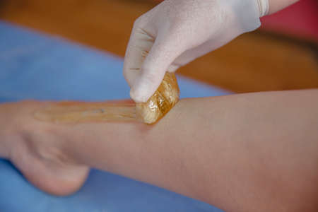 Leg sugaring, hand of cosmetician. Epilation in beauty clinic.