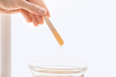 sugar paste or wax honey for hair removing flows down from waxing spatula stick. beauty spa concept. sugaring depilation.