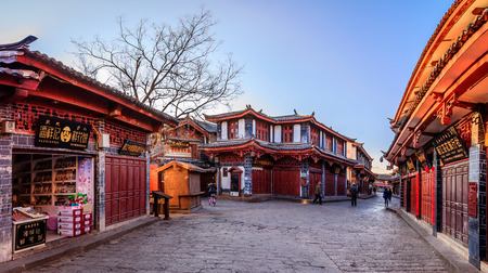 Yunnan, China - 22 March 2016: Lijiang ancient town old streets and shophouses on sunny morning.