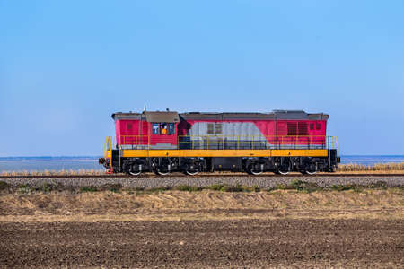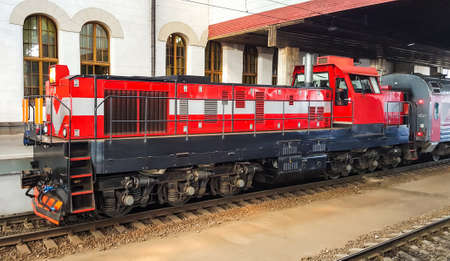 Old red diesel engine locomotive at the railway station. Vintage train staying on the railroad