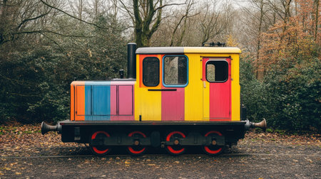 A captivating vintage train engine painted in vibrant hues sits in a serene autumn forest, showcasing its playful design amidst natural beauty.