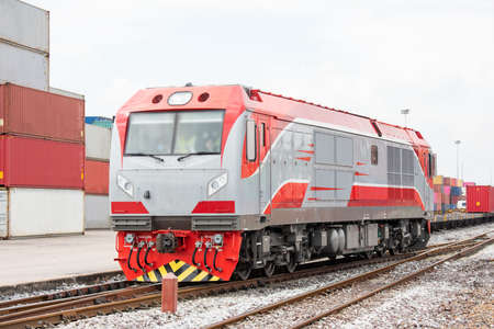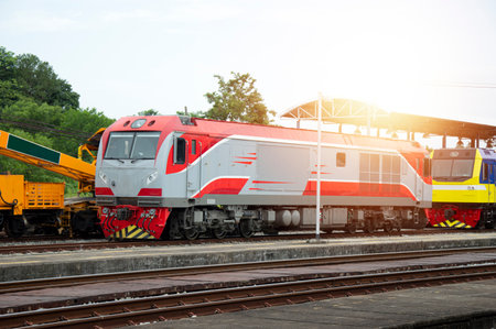 The train is running to the destination station when the sun is going down in the evening in a Inland Container Depot way in Thailand.