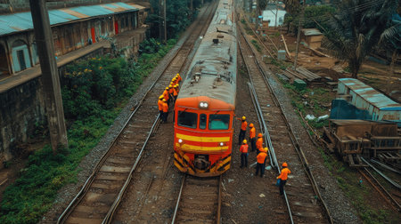 A team of railway engineers clad in orange safety gear inspects a train on the tracks, showcasing teamwork and dedication to railway maintenance.