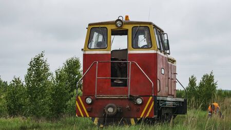 View of a narrow gauge railway locomotive on forest background. Extraction and transportations of peat.