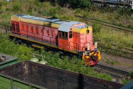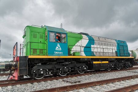 Tobolsk, Russia - July 15. 2016: Sibur company. Denisovka railway station. Shunting locomotive in action. Russia