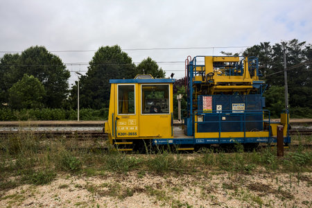 Railroad tracks and a service vehicle on a track seen from its edge on a cloudy day in the Italian countryside