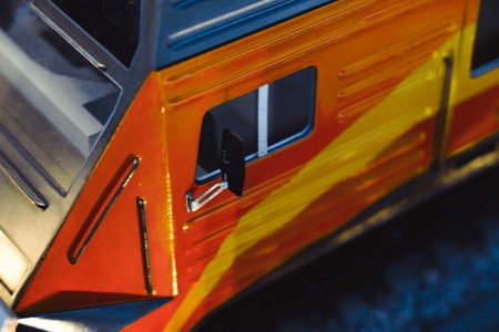 Abstract of a small orange locomotive, focus on lights and metal parts.