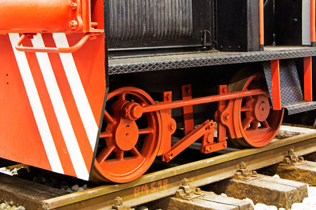 iron wheels of steam engine locomotive train on railway track, old and classic period train.