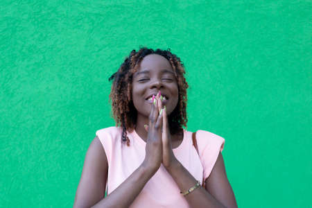 An African American woman makes a gesture of prayer and gratitude