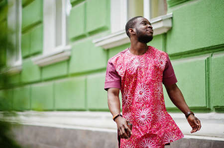 Portrait of a black young man wearing african traditional red colorful clothes.