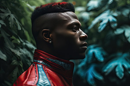 a black man with short hair and red leather jacket looking into the distance while standing in front of green leaves