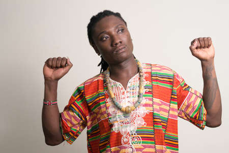 Young handsome African man with dreadlocks in traditional clothing thinking with fists raised