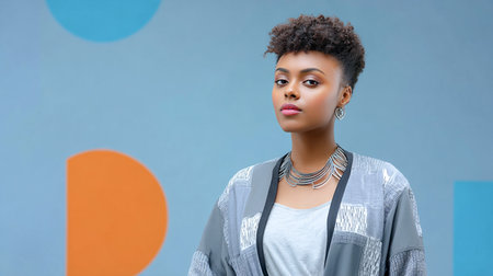 Confident African American woman in a trendy gray kimono stands against a vibrant geometric backdrop, highlighting contemporary fashion and personal style