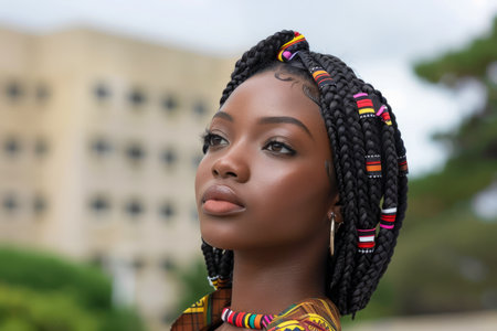 Portrait of a Young African Woman with Traditional Hairstyle and Colorful Accessories Outdoors AI Generative