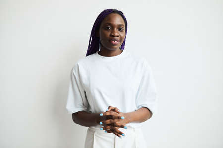 Minimal waist up portrait of young African-American woman with colored hair smiling at camera while standing against white background, copy space