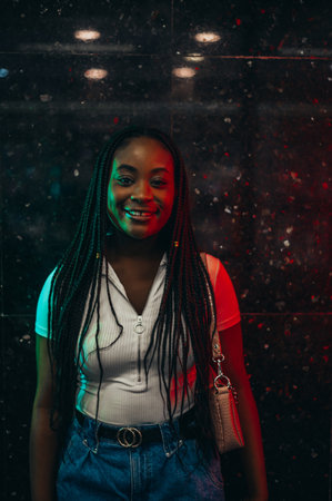 Beautiful african american woman with braids posing against the dark background illuminated by the lights