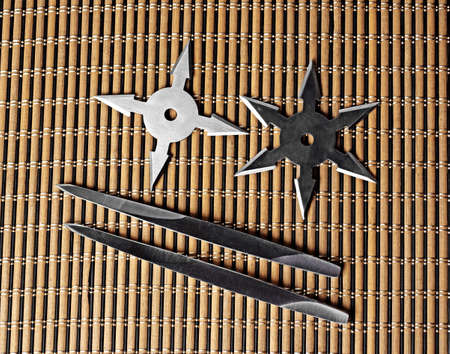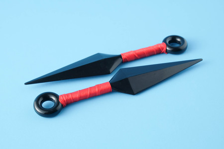 To throw ninja weapons isolated on blue paper background