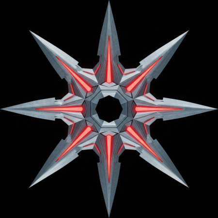 A highly detailed, metallic, eight-pointed star weapon with sharp edges and glowing red energy accents against a black background.