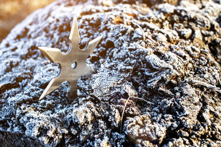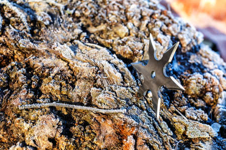 Shuriken (throwing star), traditional japanese ninja cold weapon stuck in wooden background, Silver shuriken with star shape. Samurai, throwing weapons