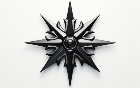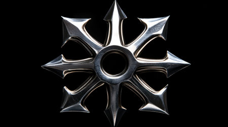 A striking metal star shape features sharp points and a reflective surface, creating a stunning visual against a solid black background. Perfect for artistic projects.
