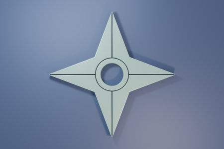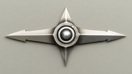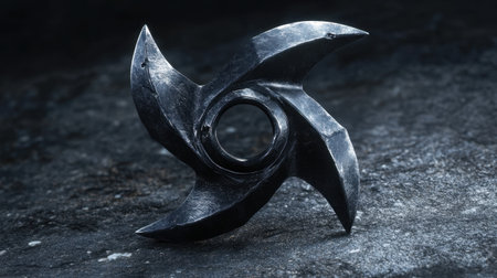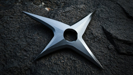 A sleek metallic ninja star rests on a dark textured surface, showcasing its sharp edges and modern design. Perfect for martial arts and weapon photography.