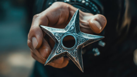 A dramatic closeup of a silver star shuriken held in a hand, showcasing intricate designs. This image captures the essence of martial arts culture and precision.