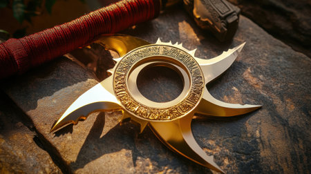 A striking golden throwing star is placed on a rocky surface, showcasing intricate designs and sharp points. The image captures the essence of martial artistry.