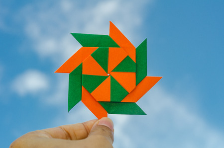 Hand holding weathercock origami folding paper over blue sky background