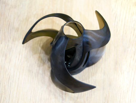 A stylish metal object featuring a unique blade design, set against a textured background. Ideal for themes of creativity, artistry, and modern aesthetics.