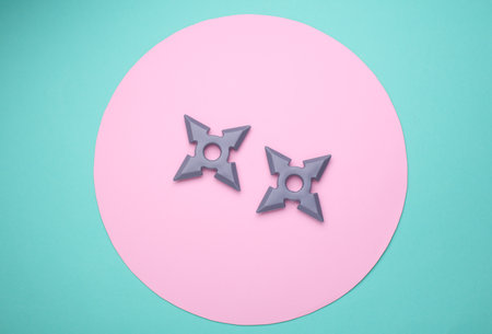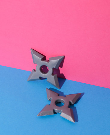 Toy plastic ninja shurikens on pink blue background