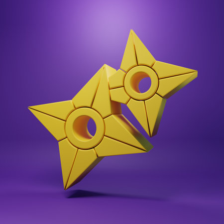 Yellow Japanese ninja shuriken icon isolated on purple background. Minimalism concept. 3D render illustration.