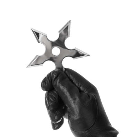 Hand is throwing ninja shuriken isolated on white background