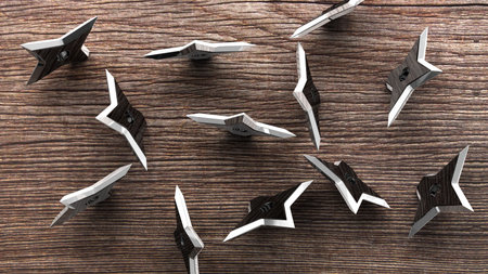 Shuriken - Ninja’s throwing stars on wood background.3DCG illustration.