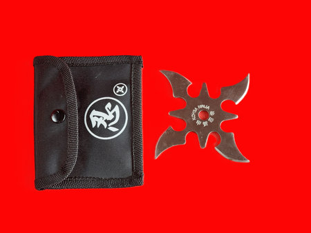 Throwing star shuriken, traditional Japanese ninja bladed weapon and black case on red background. Made in China inscription.