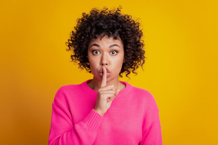 Portrait of charming pretty girl finger close mouth look camera on yellow wall