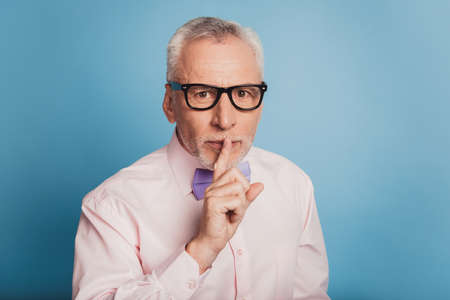 Pleased grey-haired man in eyeglasses showing silence gesture isolated over blue background